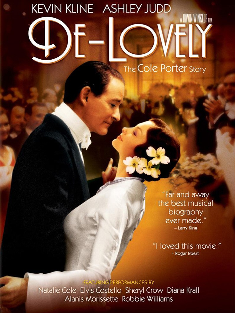De-Lovely is a musical biography on Cole Porter that portrays his life, marriage, other relationships both professional and personal, and his career alongside his music. We see Cole Porter (Kevin Kline) meeting Linda Lee (Ashley Judd) and deciding to marry. There’s was an advantageous marriage because Linda, much like a manager does everything to promote his career. She believes implicitly in his music and his music’s ability to move people. She also uses the trajectory of his career to take him away from relationships she does not approve.
